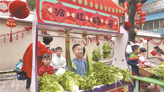在廣東省育才幼兒院二院,園內張燈結彩,一派紅紅火火、熱熱鬧鬧的景象。新春廟會布置了各種各樣的攤檔,每個攤檔的設計都包含了豐富的傳統文化寓意和內涵。有讓孩子們品嘗年味的,如攤檔“大吉大利”,孩子們動動小手,寓意吉吉利利、百事如意;在“聰明伶俐”的攤位上,擺滿了各種有著好彩頭的食物,大蔥寓意“聰明伶俐”,芹菜寓意“勤奮好學”,大蒜寓意“能寫會算”,祝愿小朋友們在新的一年聰明伶俐、快高長大……
