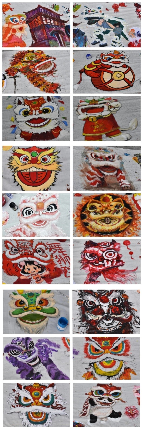 活動現(xiàn)場,遂溪許屋村騰藝醒獅團與嶺南師院體育科學學院醒獅隊聯(lián)合開展了多彩醒獅表演,美術(shù)與設計學院百名師生在表演現(xiàn)場揮毫作畫,百米長卷的多彩醒獅躍上眼簾,有黃色、金色、紫色、紅色等異彩紛呈的多彩醒獅,也有寫實、動漫、卡通、簡約、3D效果等形神兼?zhèn)涞亩鄻有血{,現(xiàn)場繪制的“百獅畫”為“遂溪醒獅”IP形象設計征集火熱造勢。