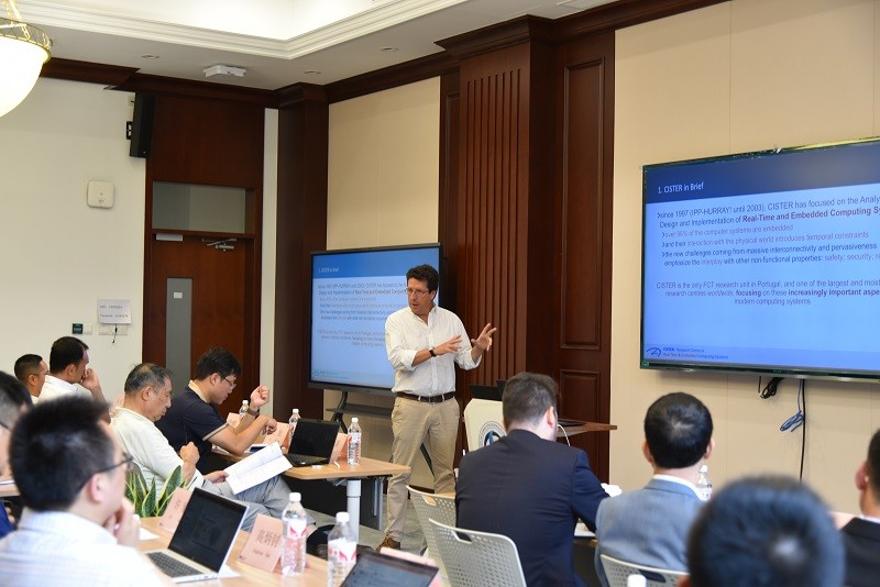 在復旦大學舉辦的“智能網聯車與邊緣計算智能”國際研討會上,葡萄牙國立實時和嵌入式計算系統研究中心(CISTER)主任Eduardo Tovar教授在做主題報告。