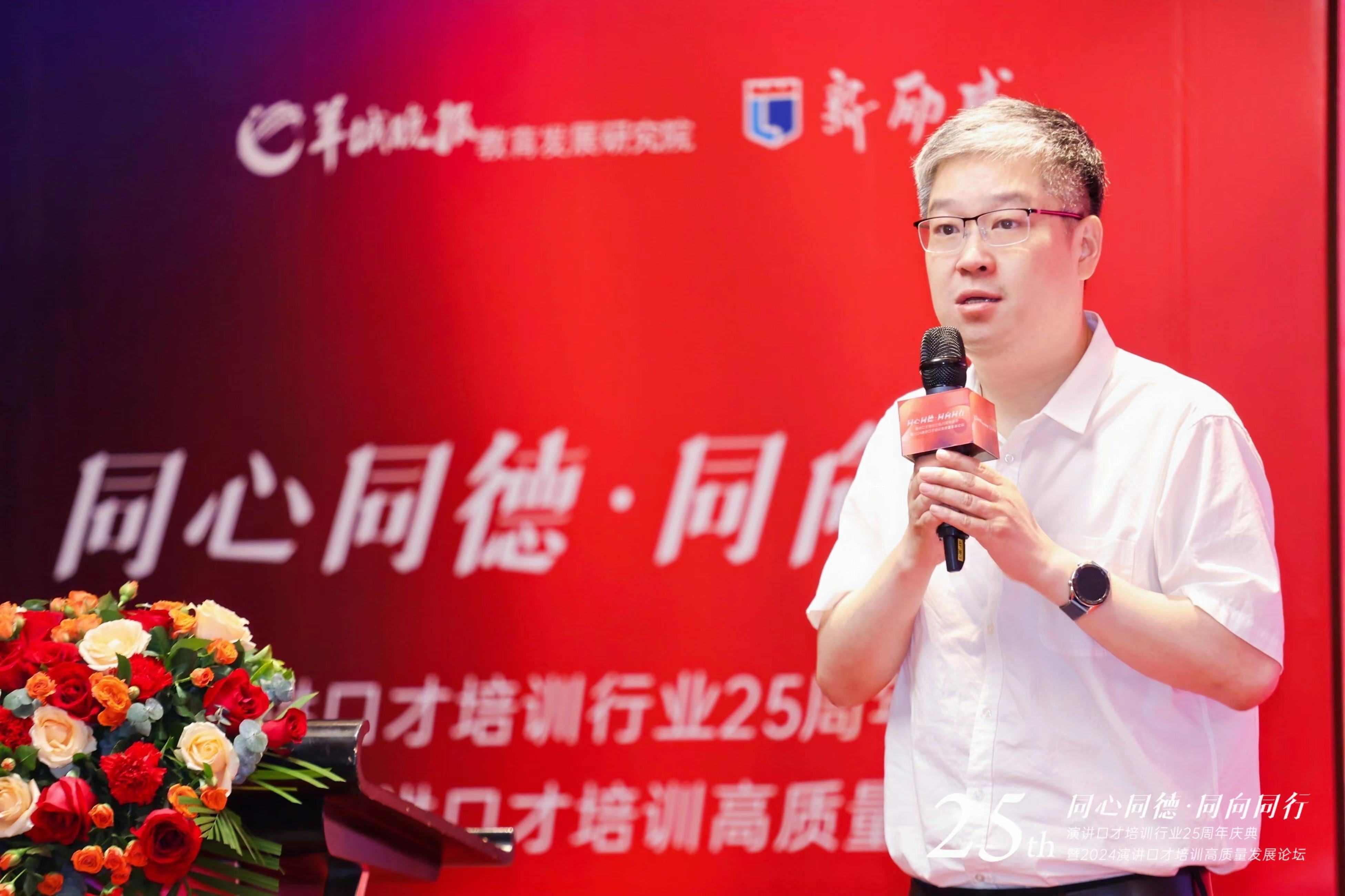 活動伊始,羊城晚報報業集團黨委委員、副社長、副總編輯胡泉代表主辦方致辭。他表示,當前正處于一個信息化、數字化高速發展的新時代,隨著科技的發展與變革,虛擬現實、人工智能等已逐漸被應用于教育行業,演講口才培訓將迎來新的挑戰和機會。“我認為越是在互動豐富的這個時代,每個人的表達、溝通、演講的能力將更加重要。”羊城晚報一直以來高舉文化大報、民生大報的旗幟,將持續關注演講口才培訓行業的發展,希望通過積極探索全媒體平臺和傳播渠道,通過教育研究院對教育專業、關注、引領的垂直服務,為推動我國演講與口才培訓的高質量發展貢獻一份力量。