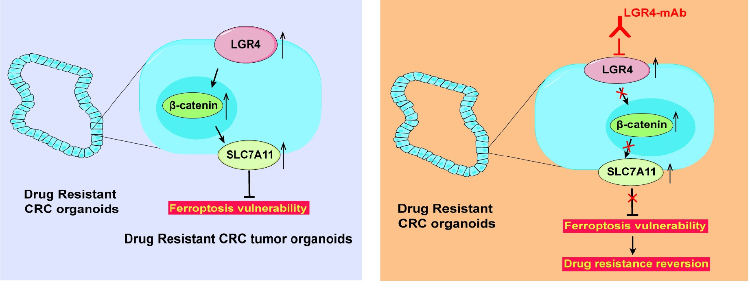 該研究以結直腸癌病人來源的腫瘤類器官為樣本,結直腸腫瘤類器官可以真實反映出患癌病人在臨床化療中的治療效果,并可以作為體外篩選抗癌藥物的工具,預測腫瘤對化療藥物的敏感性。此外,通過低濃度化療藥物誘導構建腫瘤獲得性耐藥類器官,全面分析腫瘤原發性耐藥和獲得性耐藥的原因,通過以上模型,該研究首次揭示了LGR4/Wnt/β-catenin信號通路通過直接激活鐵死亡的抵抗基因SLC7A11的轉錄來抵抗結直腸腫瘤細胞的鐵死亡。本研究闡述的藥物抵抗機制以及研發出的抗體LGR4-mAb對結直腸癌的臨床治療具有重大意義。