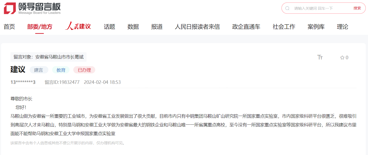 近日,有網友在人民網留言板上建議馬鞍山市幫助馬鋼和安徽工業大學申報國家重點實驗室,對此馬鞍山市科技局回復:支持寶武馬鋼、安徽工業大學積極參與到國家重點實驗室重組,目前相關工作正在穩步推進中。