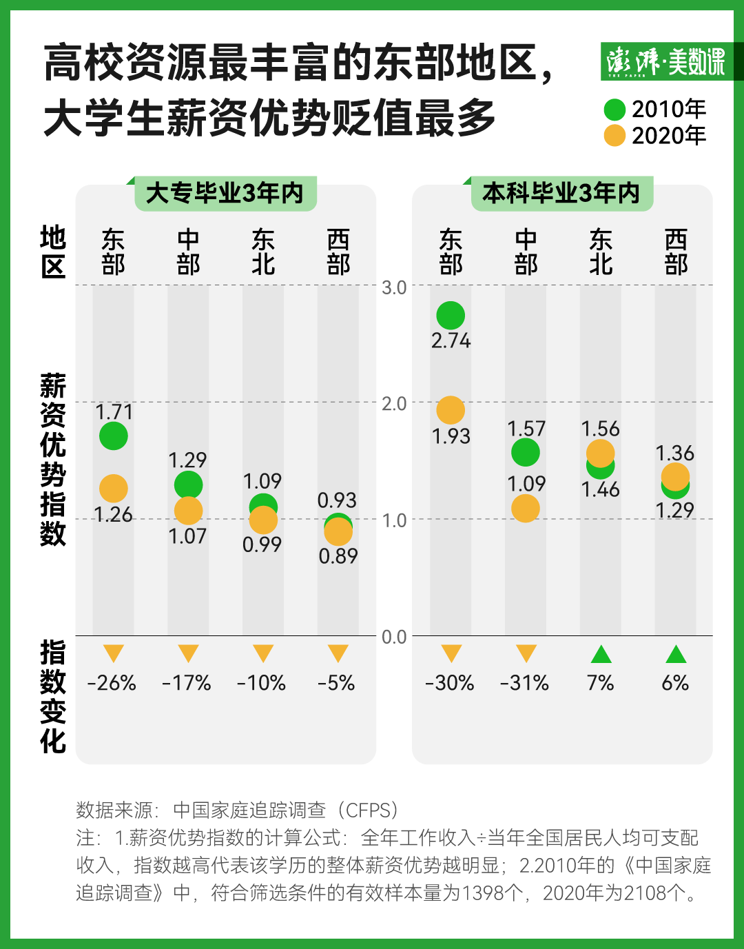 這樣就能直觀地看到,從2010年到2020年,本科學歷的受訪者中,畢業(yè)3年內的整體工作薪資優(yōu)勢出現(xiàn)了較明顯的消失,從1.89降至1.33。