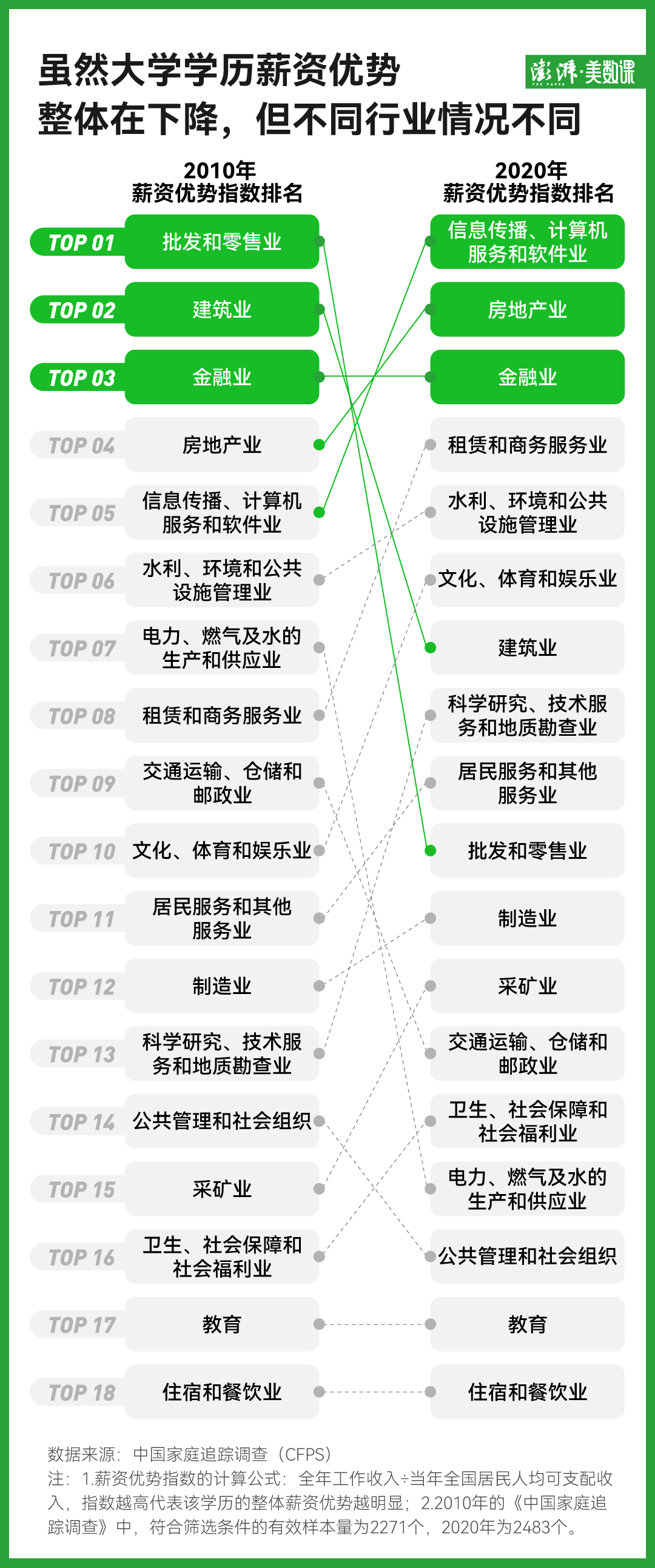 下面這份分行業(yè)的薪資優(yōu)勢指數(shù)變化,就展現(xiàn)了大學學歷在整體就業(yè)優(yōu)勢下降的背景下,在不同行業(yè)的變化情況。