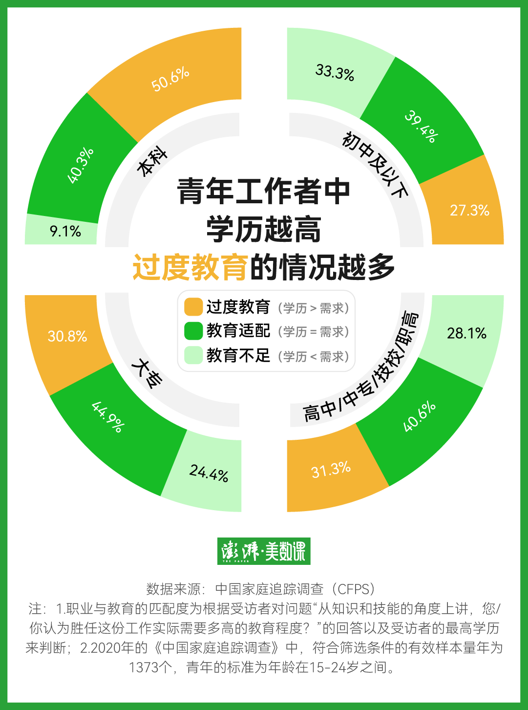 個人實際教育程度和職業(yè)崗位所需教育程度的匹配情況,可分為教育不足、教育適配和過度教育三種。而我們通過分析2020年的《中國家庭追蹤調查》數(shù)據(jù)后發(fā)現(xiàn),畢業(yè)3年內的本科學歷工作者中,過半的人覺得自己的工作不需要大學學歷。