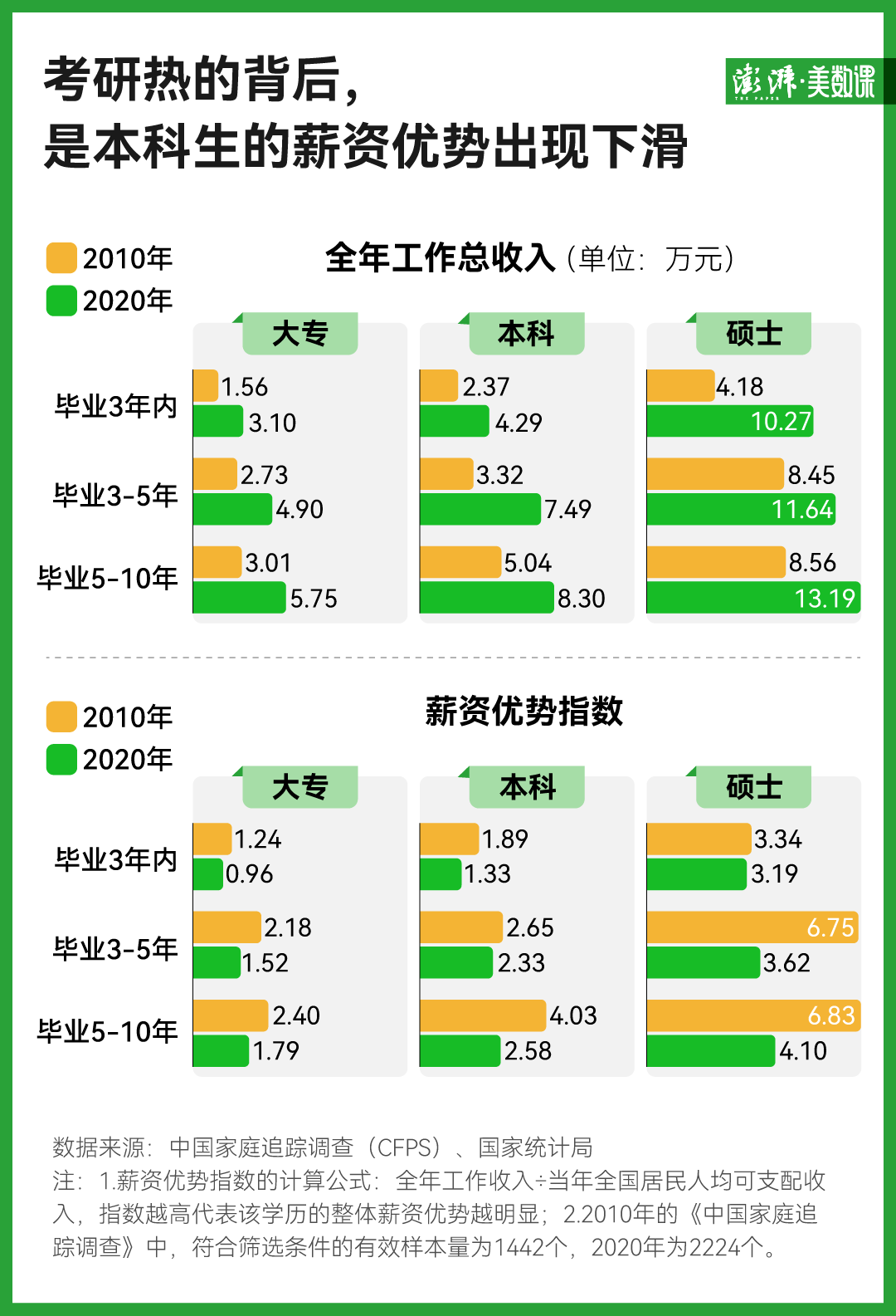 學歷真的在通貨膨脹嗎?對此,澎湃美數(shù)課通過分析2010年和2020年的《中國家庭追蹤調查》來找尋回答,該調查由北京大學中國社會科學調查中心實施,旨在反映中國經濟、教育等領域的變遷。