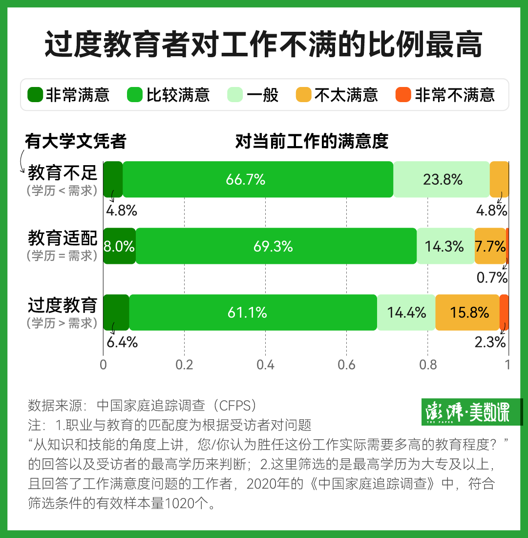 除此之外,更高的學歷在工作時,甚至還可能起到反作用。在“大材小用”的就業(yè)狀況下,很多人會產生失落感。根據(jù)我們的計算,相比教育不足或教育適配,過度教育者對自己工作的不滿比例是最高的。