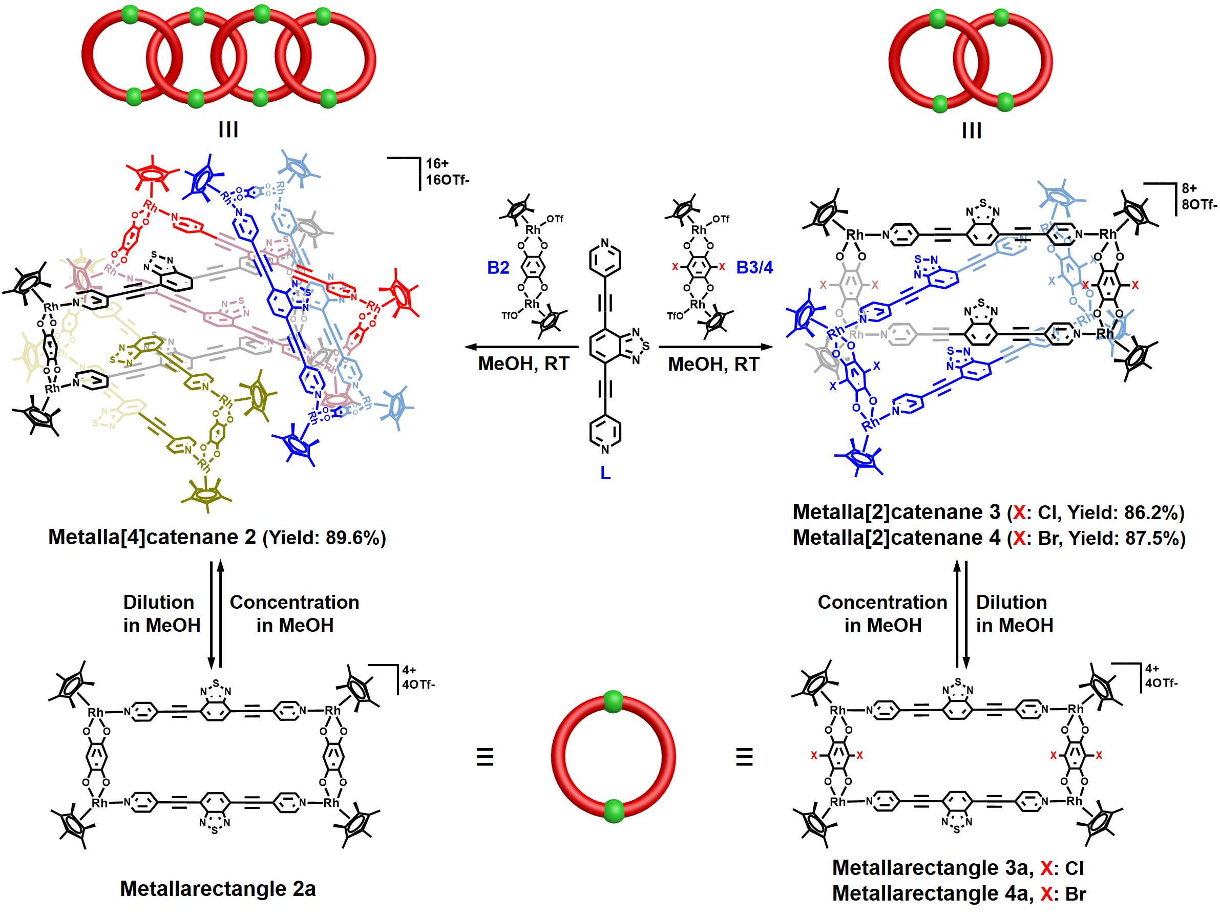 本研究設計利用一種雙齒苯并噻二唑衍生物連接配體與雙核Cp*Rh基前驅體配位自組裝,一步選擇性合成得到由4個有機金屬大環組成的同環線性[4]索烴化合物。X-射線單晶衍射結果證實,該配位超分子化合物是一種罕見的同環線性金屬[4]索烴結構,4個互鎖但不連接的有機金屬大環形成了一個具有六個交叉點的不可分割的整體,強的夾層型π-π堆疊相互作用和非經典氫鍵作用對金屬[4]索烴結構的形成和穩定性起著至關重要的作用。研究進一步發現,通過調節雙核Cp*Rh基前驅體上的芳香環取代基,能夠得到同環金屬[2]索烴分子。高分辨質譜和核磁共振研究結果證實,金屬索烴化合物和相應的單環之間可以通過改變其濃度來實現可逆的結構轉變。