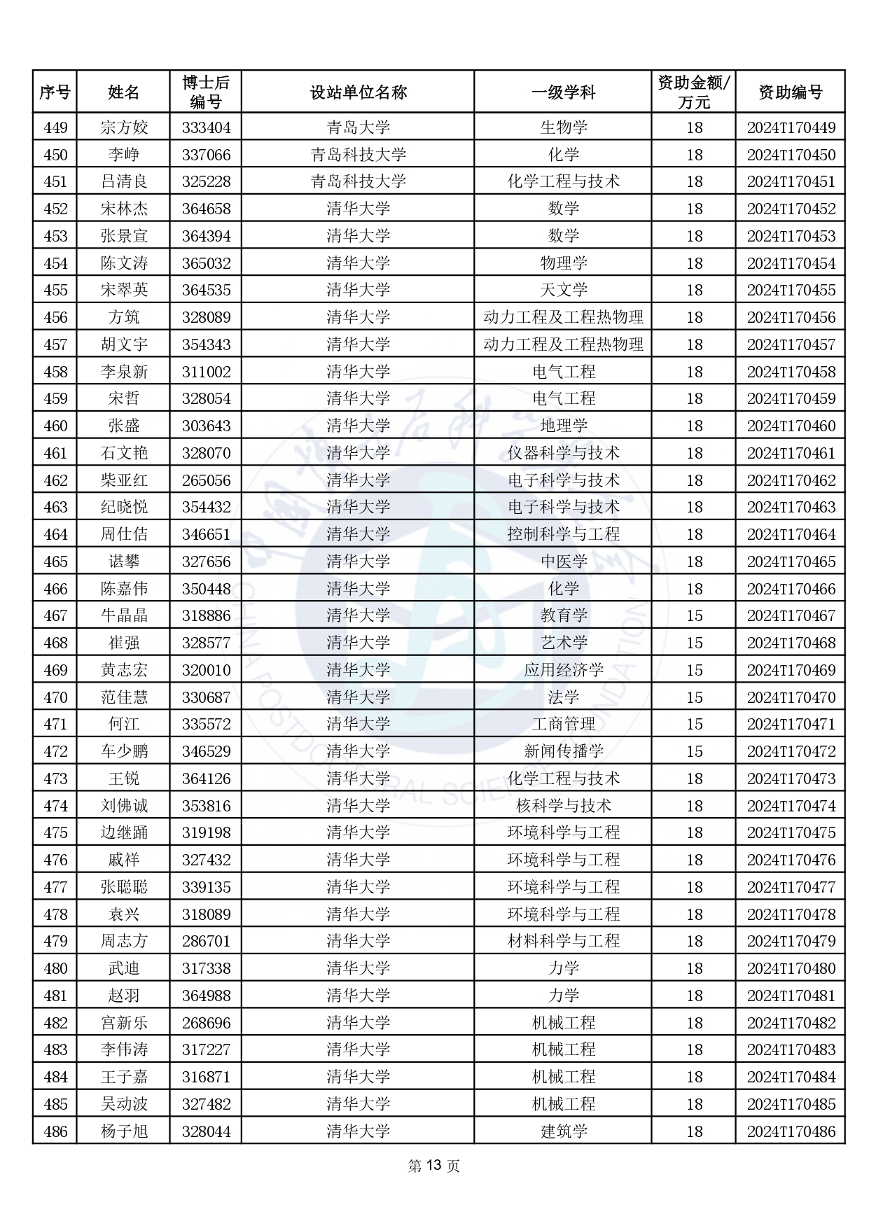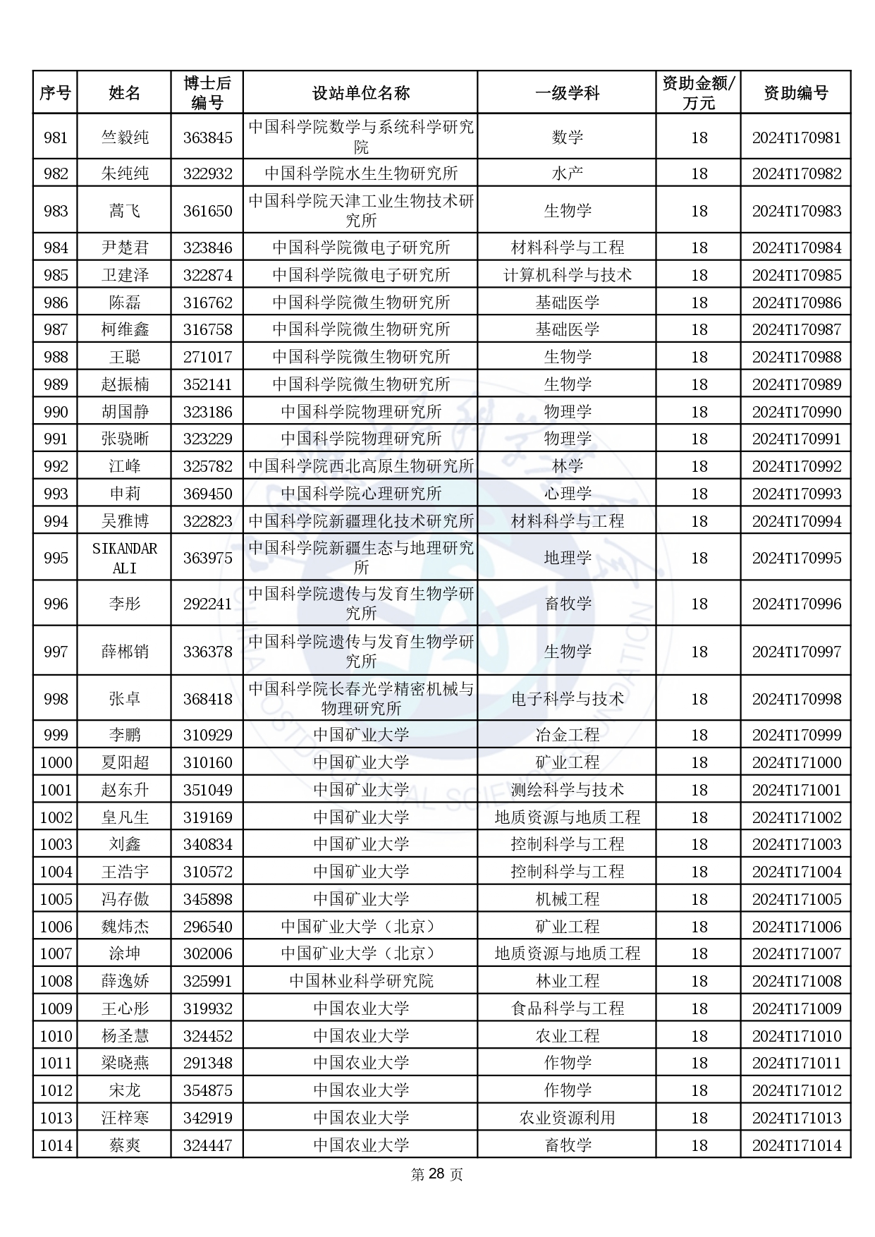 2024年度中國博士后科學基金第17批特別資助獲資助人員名單公布