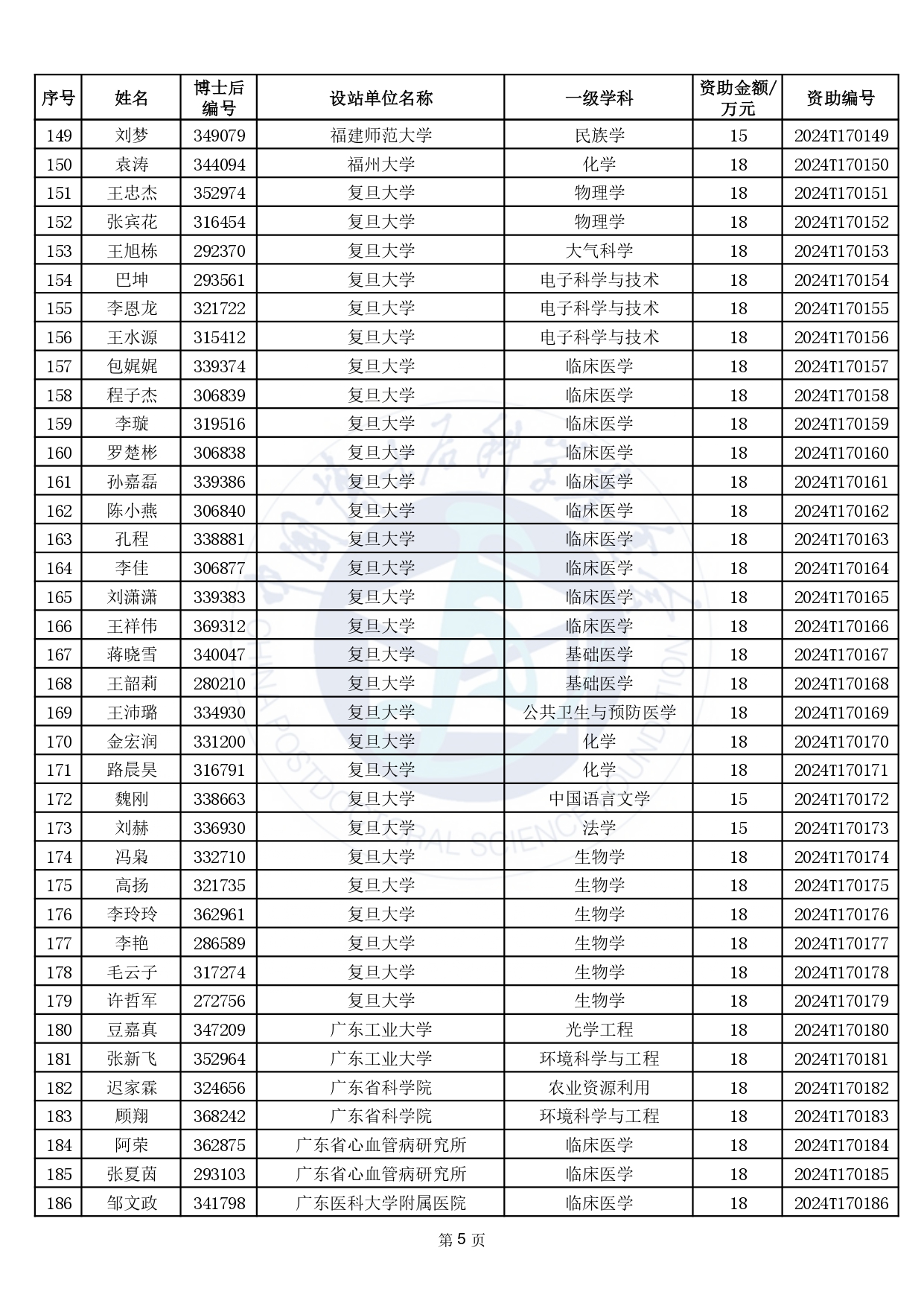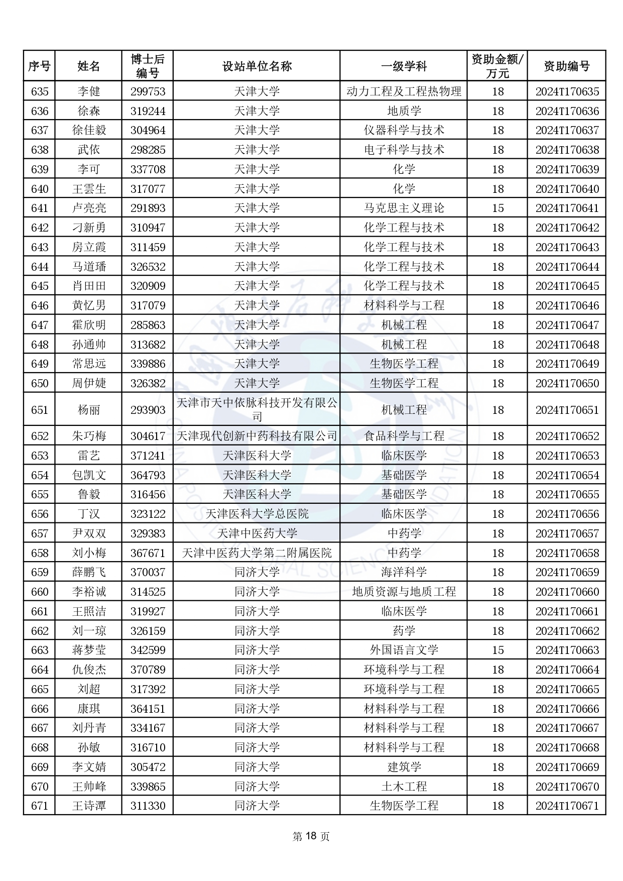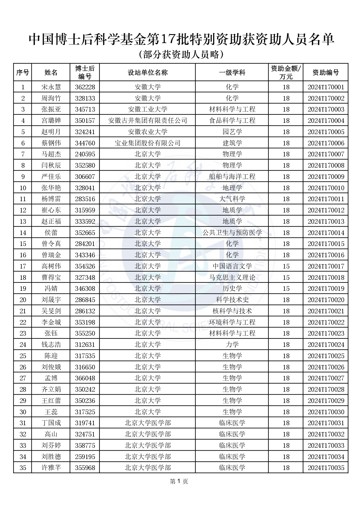 關于公布2024年度中國博士后科學基金第17批特別資助獲資助人員名單的通知
