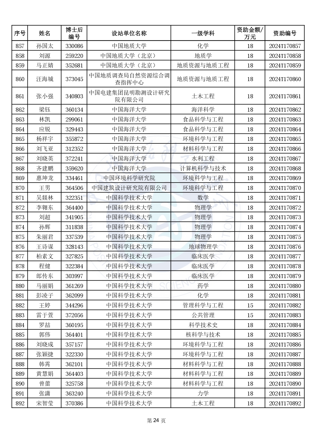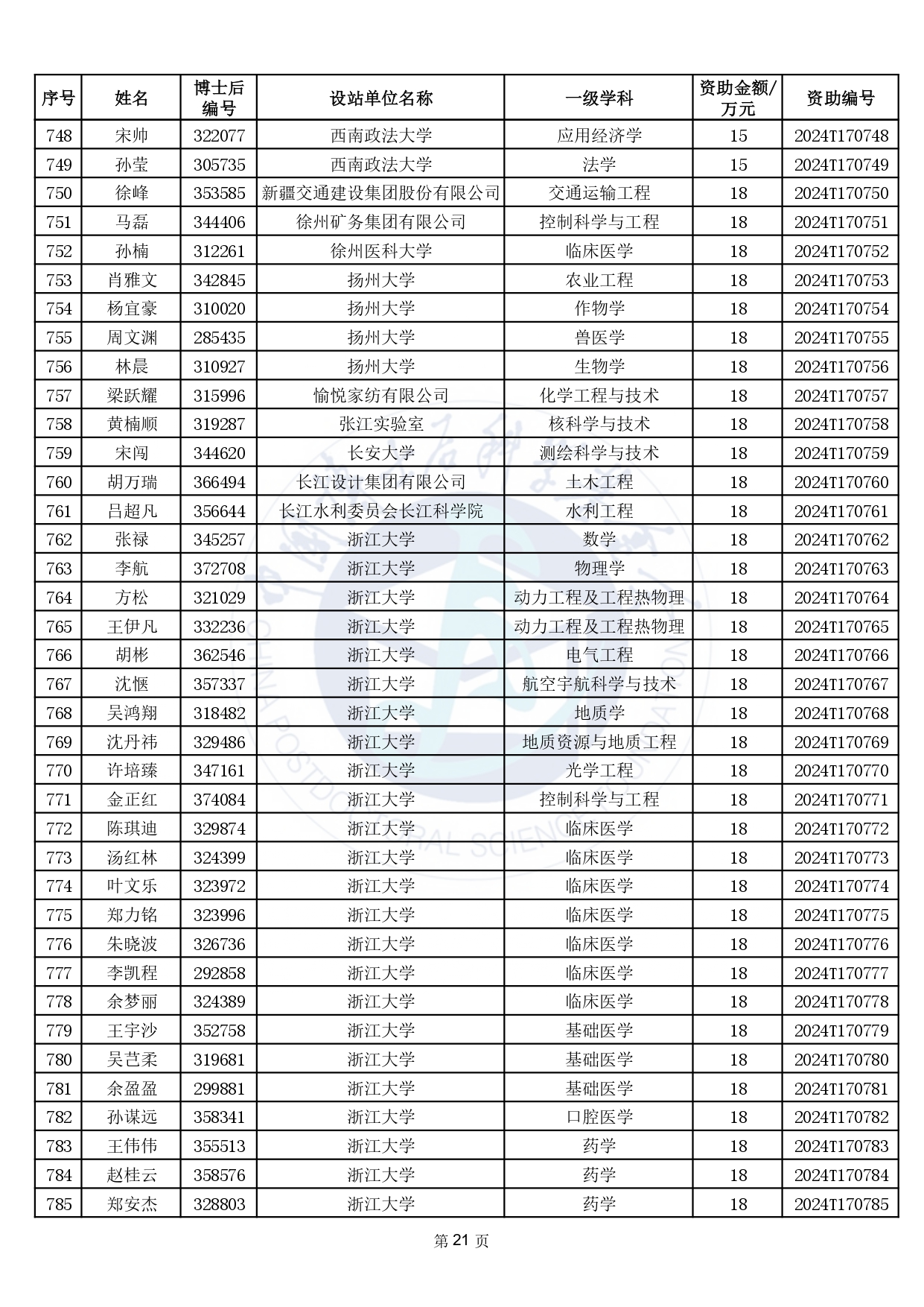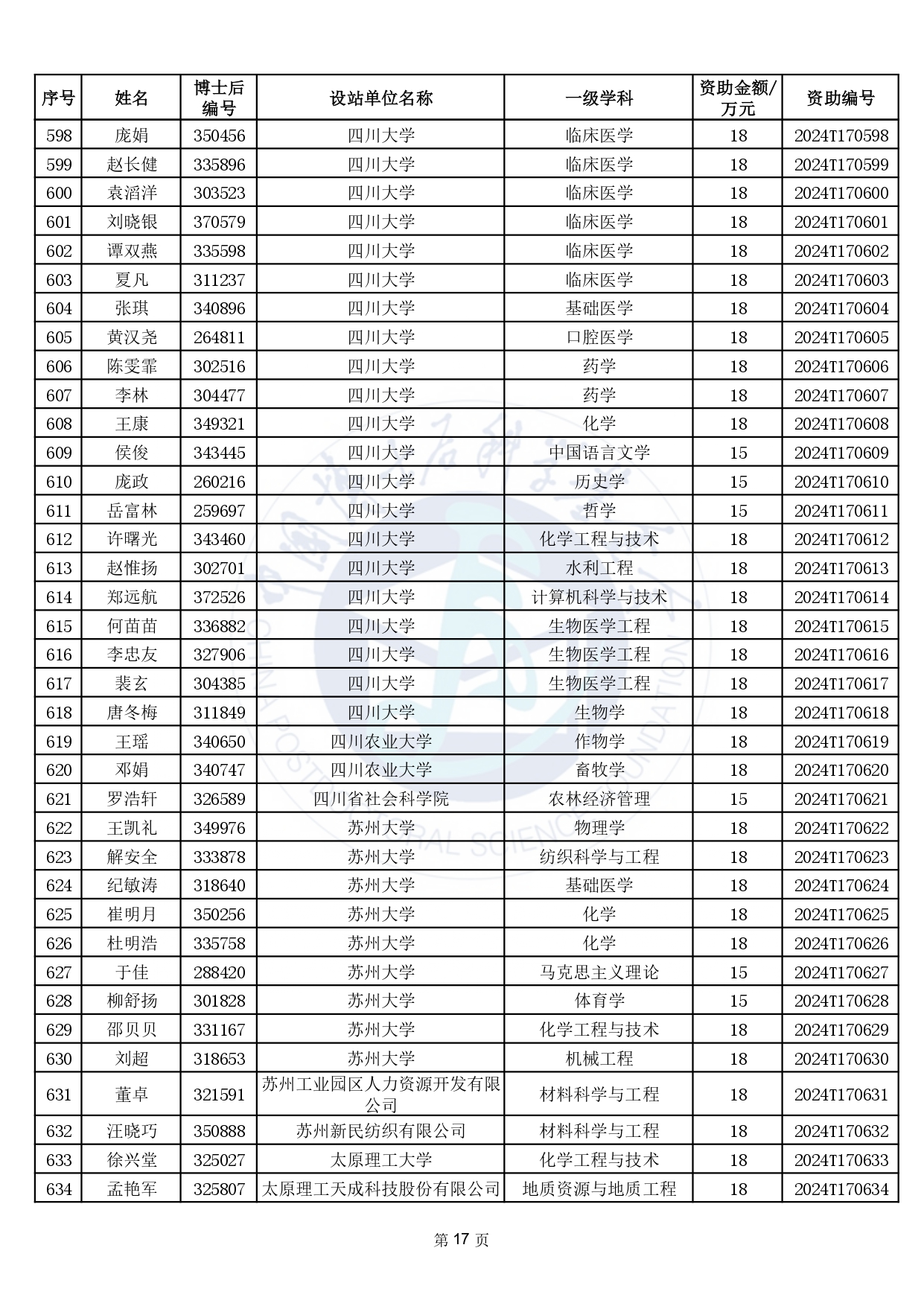 2024年度中國博士后科學(xué)基金第17批特別資助獲資助人員名單公布