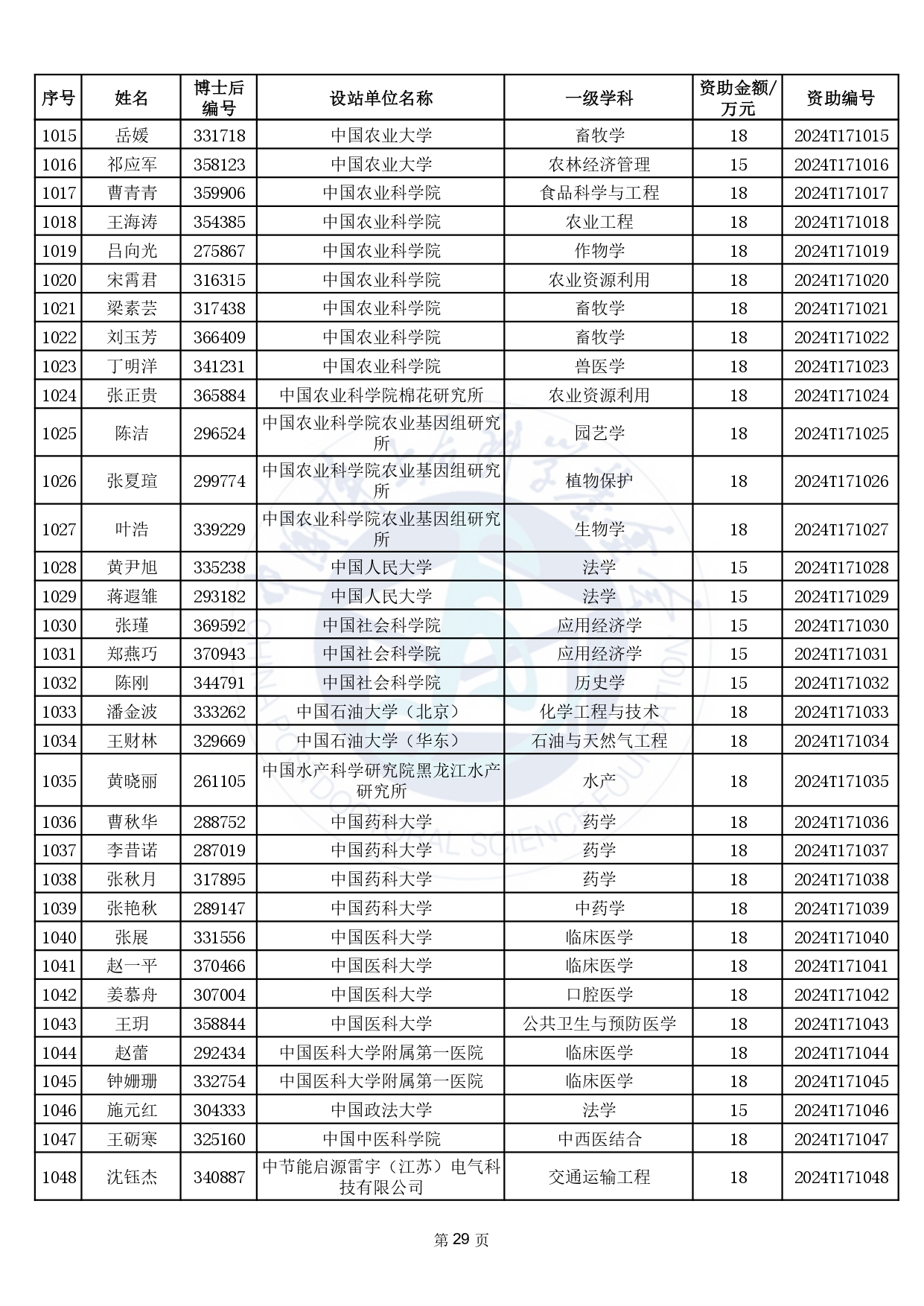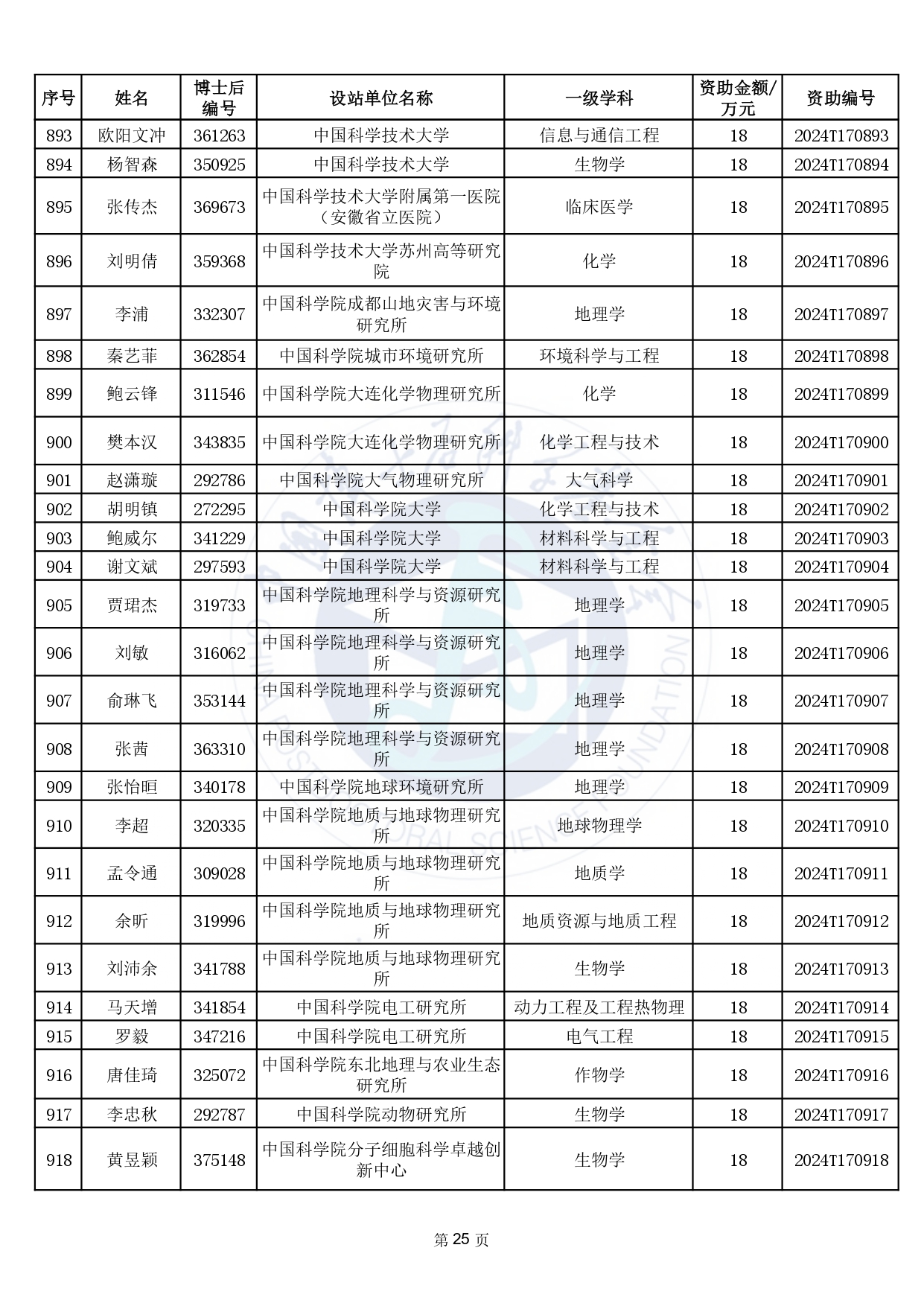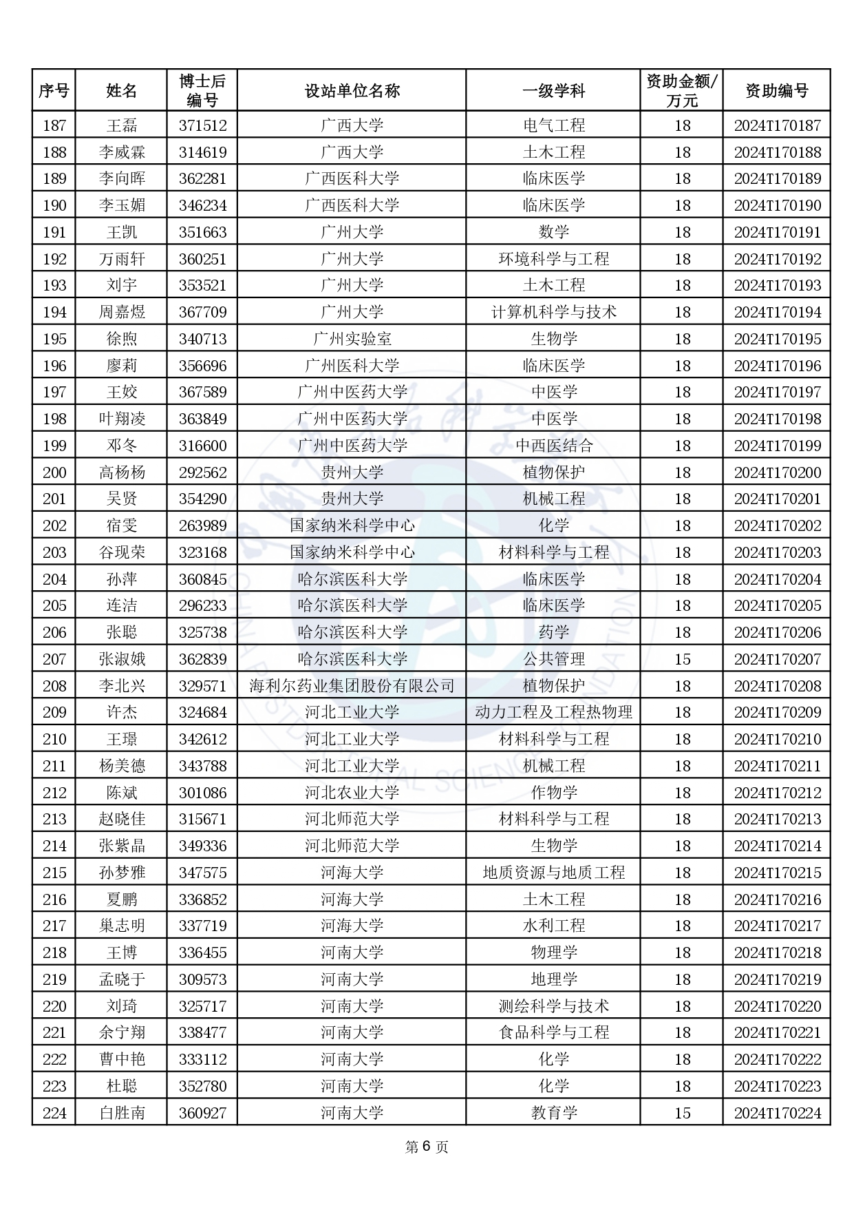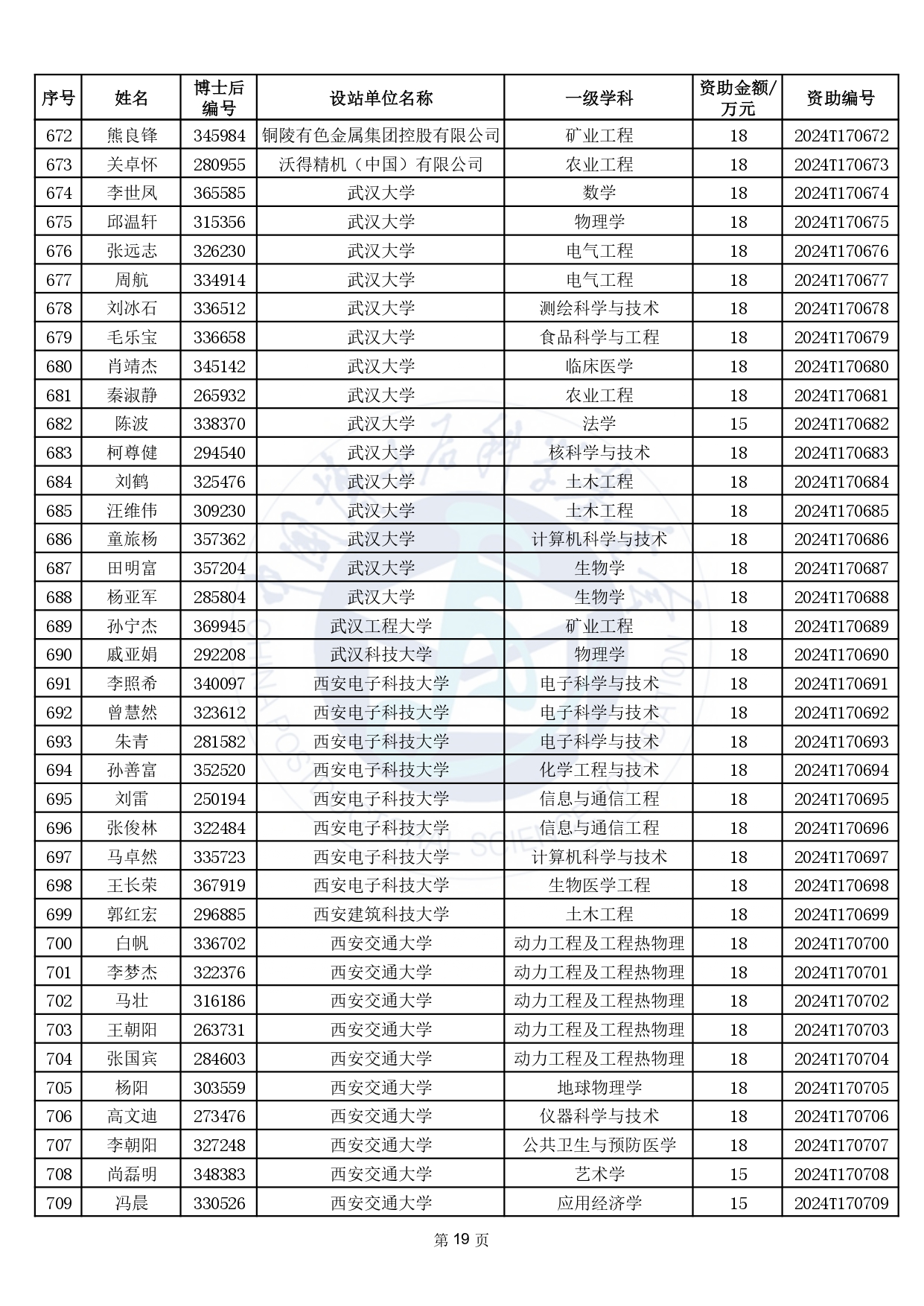 2024年度中國博士后科學(xué)基金第17批特別資助獲資助人員名單公布