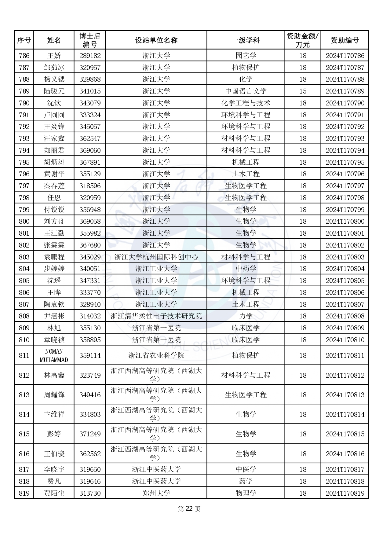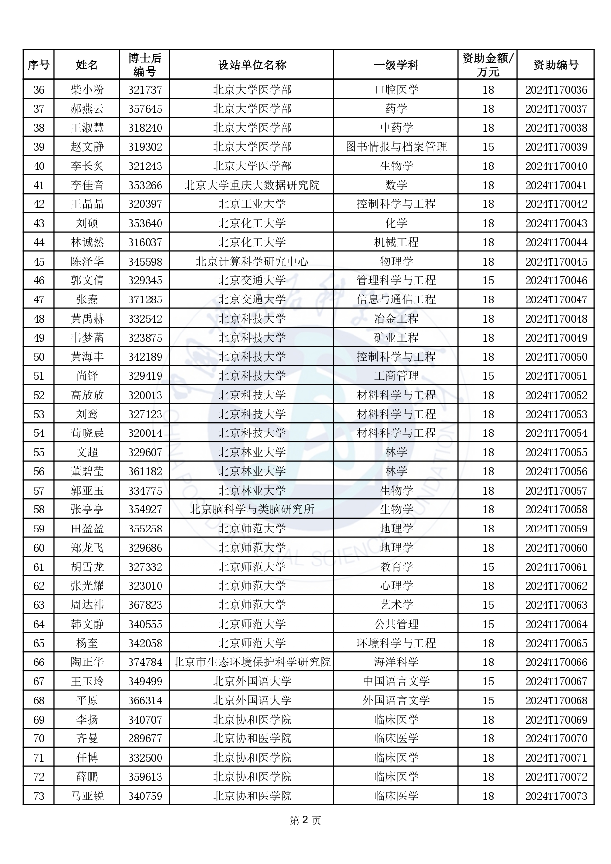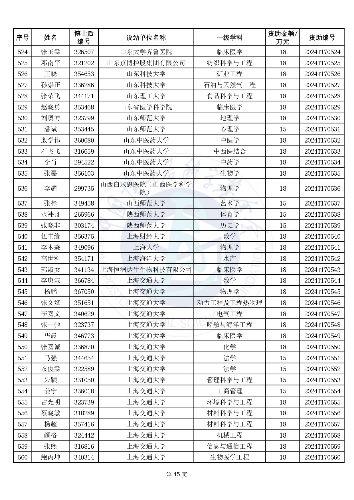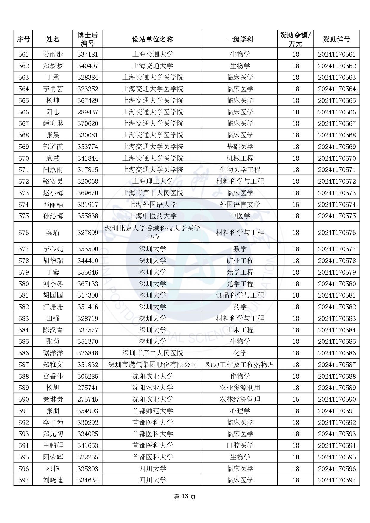 2024年度中國博士后科學基金第17批特別資助獲資助人員名單公布
